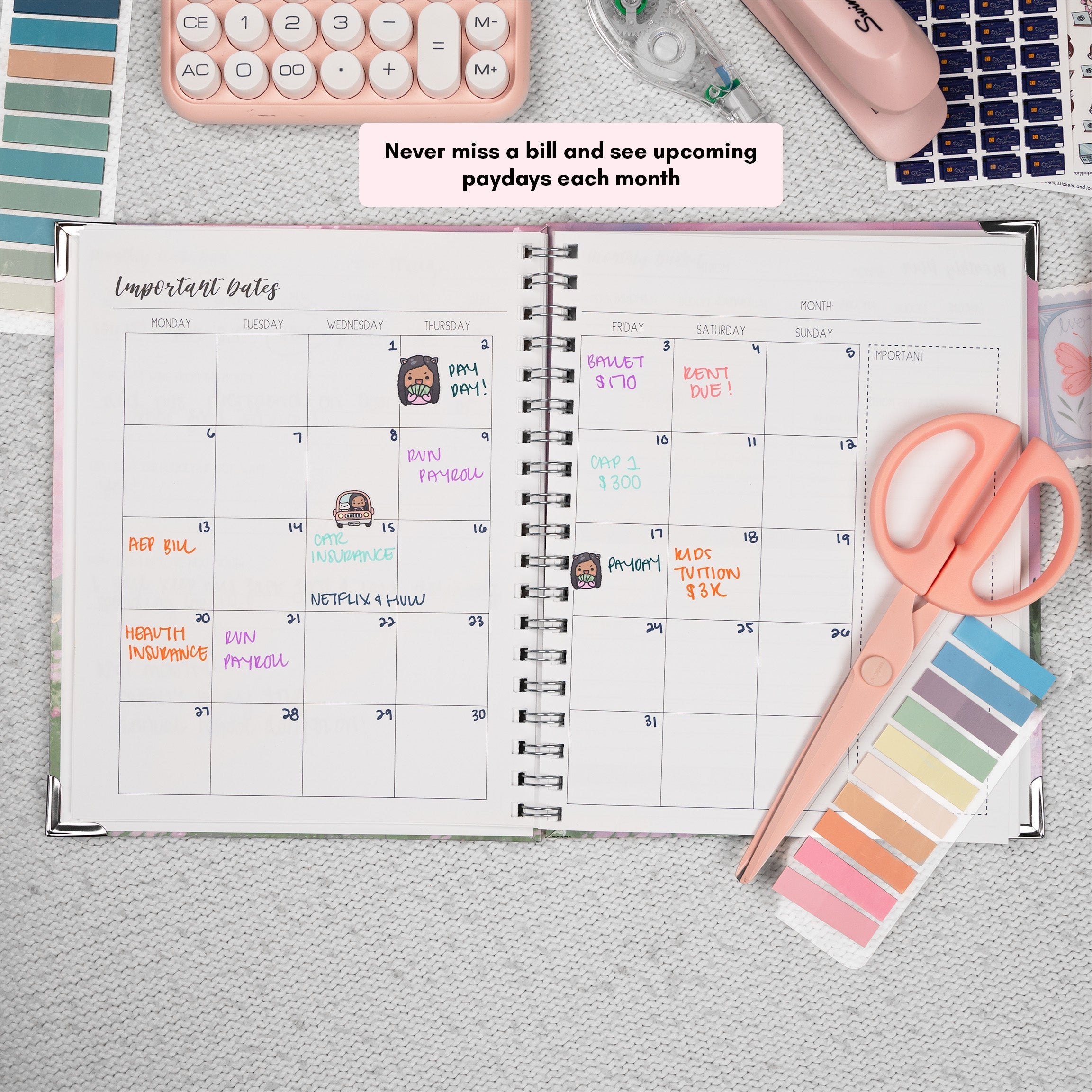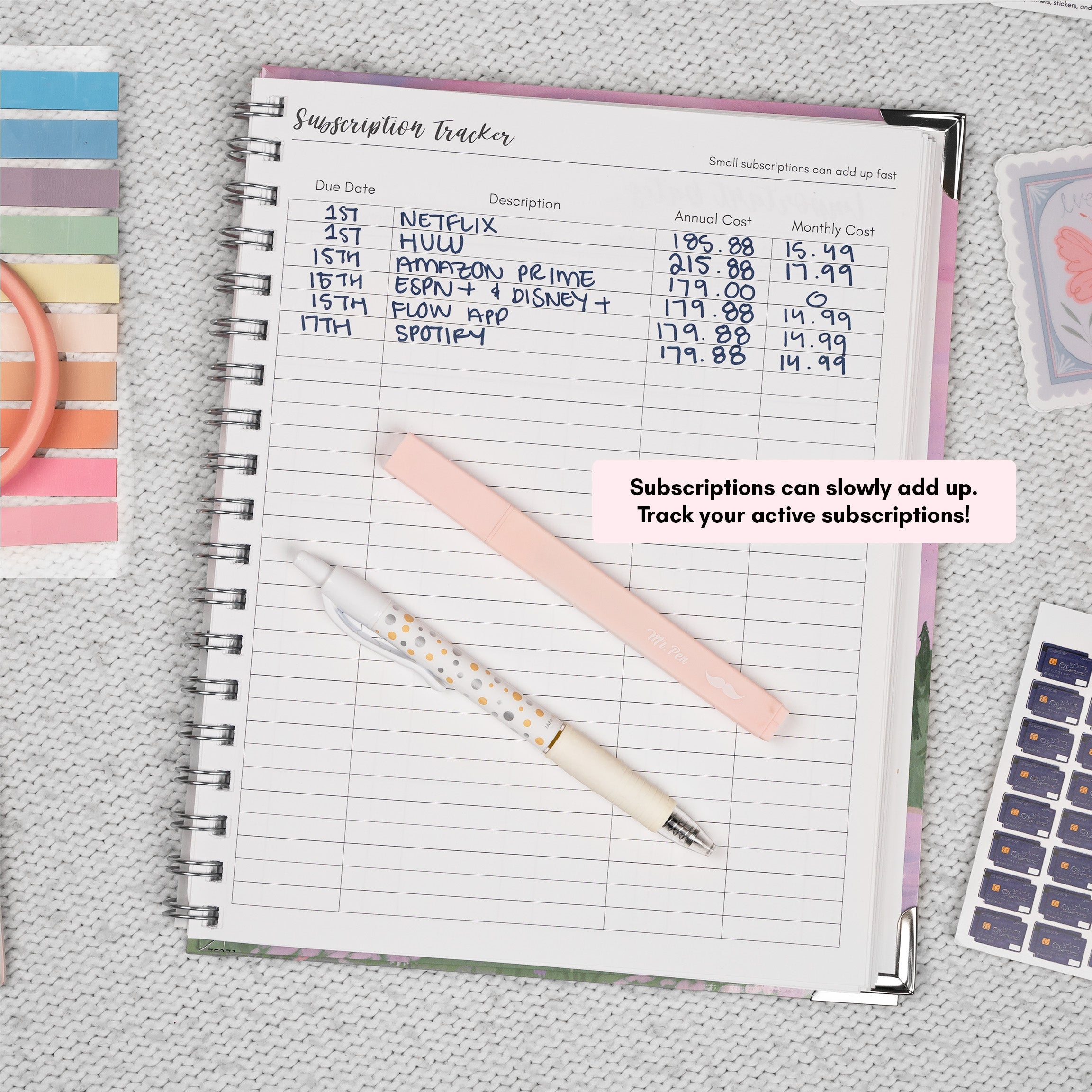 The Budget planner features 12-months of finance tracking and is non-dated to never waste a page.