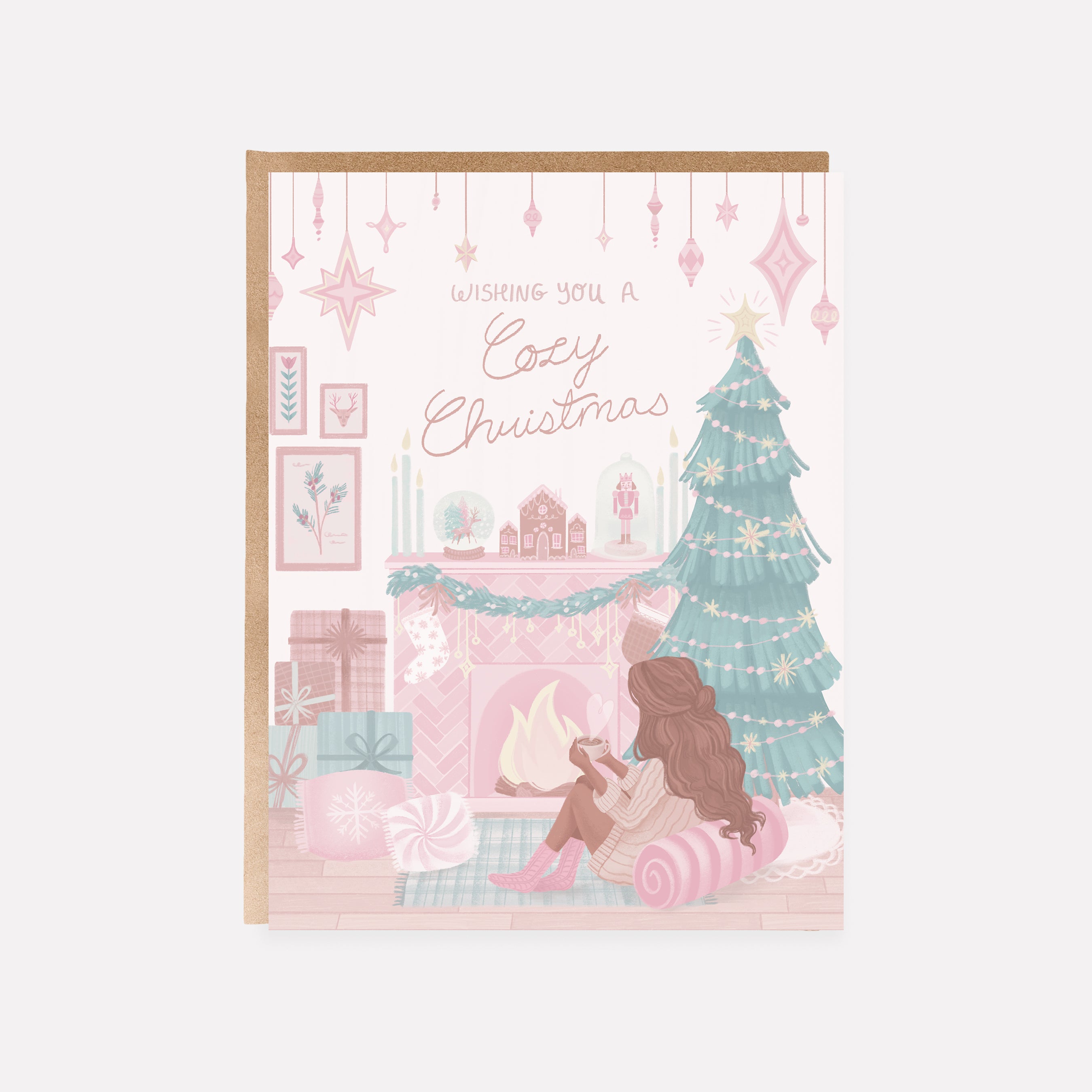 A pretty Christmas cards filled with pink and green colors! Grab your hot chocolate or coffee and sit around the fireplace for the holiday season. This Christmas card has a bunch of fun details and is cute for any person that likes asthetically pleasing greeting cards. The blank interior allows you to write a special handwritten note. Thick, Premium Card Paper.