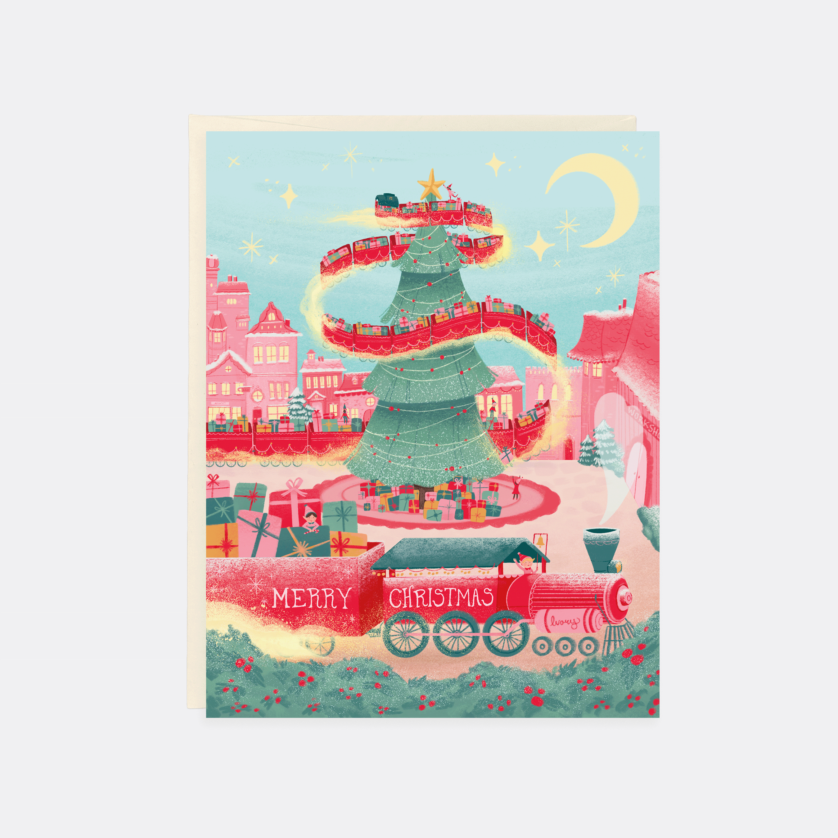 The elves finished all the gifts in this Christmas card! They loaded up the gifts in the Elf Express to bring to Santa to be delivered around the world. This greeting card is centered around a small cute elf town with their magical train.The blank interior allows you to write a special handwritten note.Thick, Premium Card Paper.