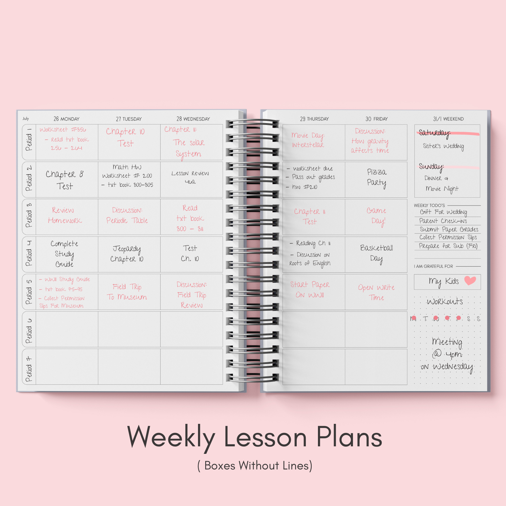 Your most organized school year starts with The Teacher Lesson Planner! The perfect planner for teachers & homeschooling parents that thrive by keeping organized. Choose your start date & you can personalize your premium hard cover. There is a 7 period weekly layout that allows for planning Monday through Friday. There is even a box for weekend planning and many other pages that will help you reduce stress & enjoy your school year!