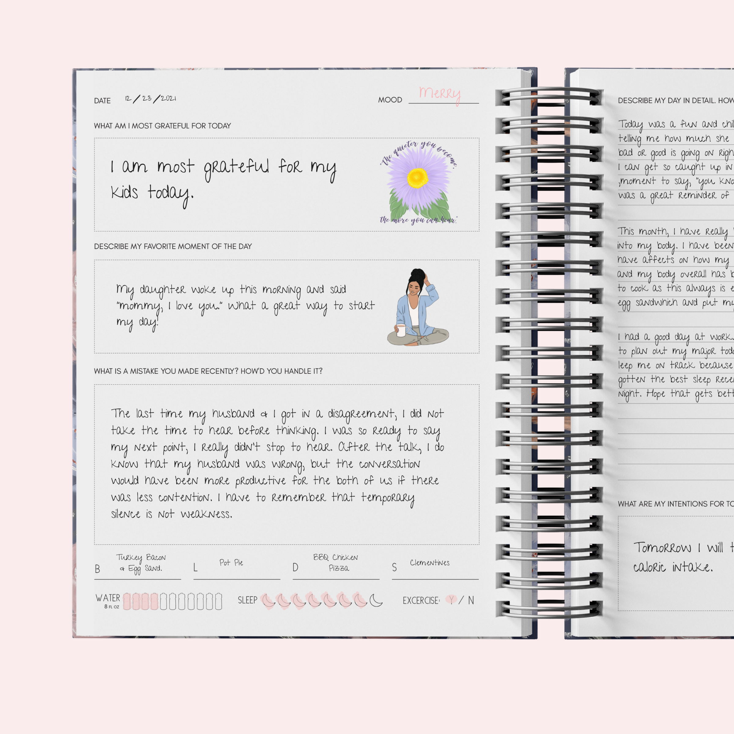 The wellness journal is the perfect tool to help guide your daily mental wellness journey. This is a special journal as it has a consistent gratitude & daily decompress section, but also has a variety of daily prompts of the day to allow you to better understand yourself. The wellness journal is a 90 day journal.