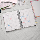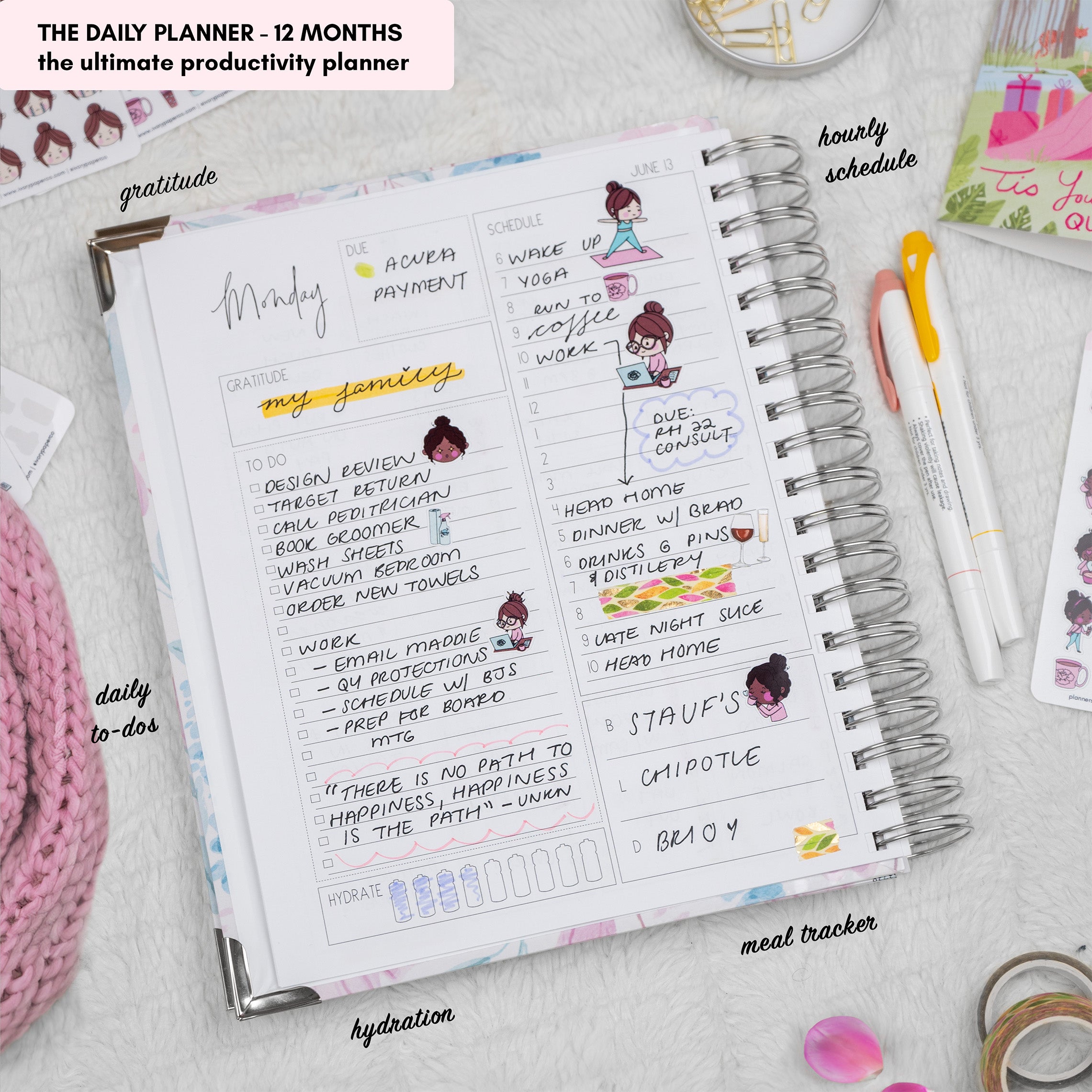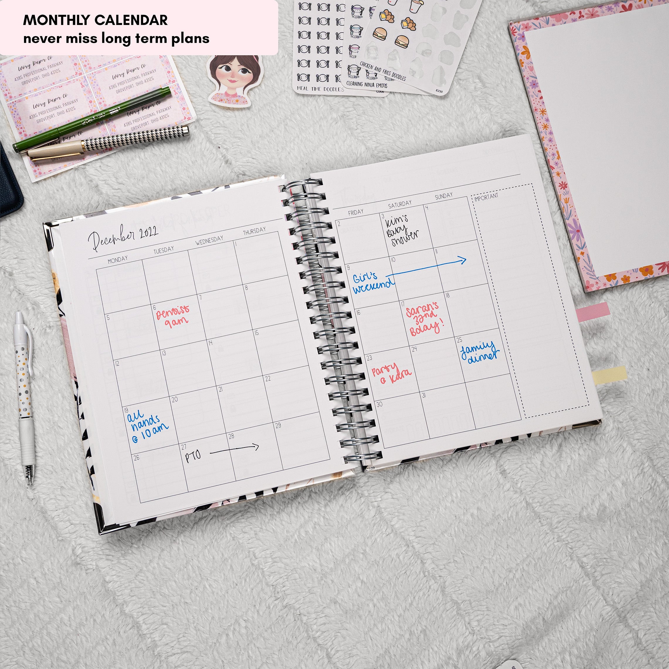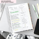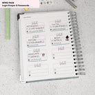 Designed to simplify your life, this daily planner includes weekday pages with a shared weekend layout. You'll find hourly time slots from 6 a.m. to 10 p.m., as well as sections for gratitude, priorities, meals, and hydration. Each month features a spacious overview to track long-term goals, and the 104 GSM paper minimizes ink bleed.